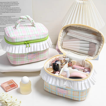 Estilo coreano Nicho Design Torção Moda Portátil Poliéster Zipper Cosmetic Bag Soft Handle 3-6L Grande Capacidade Plissada Lace